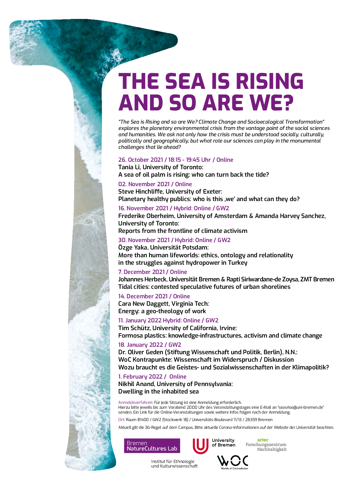 The programme for this lecture series was organised by Bremen NatureCultures Lab, a cooperation between the artec Research Centre for Sustainability and the Institute of Anthropology and Cultural Research (IfEK) at the University of Bremen.