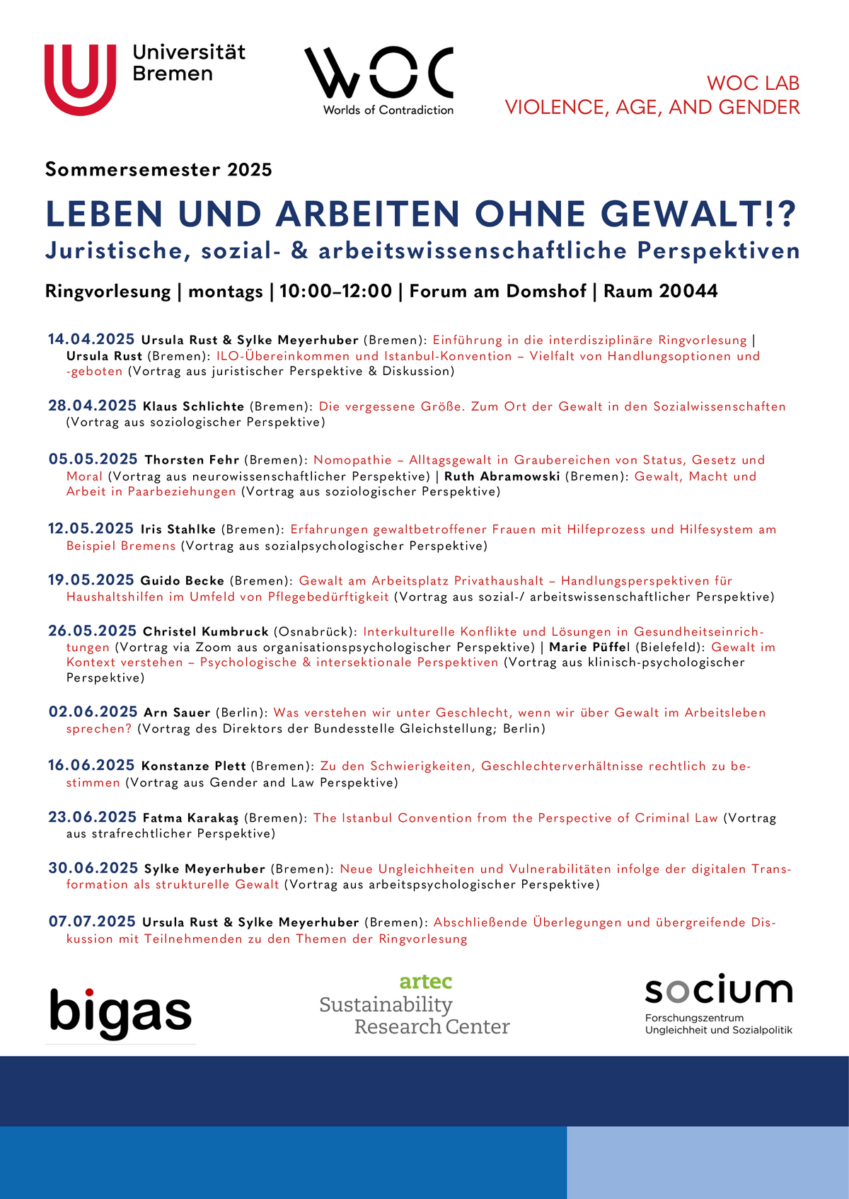 The interdisciplinary lecture series is explicitly aimed at students from various disciplines, in particular law, sociology, psychology, but also labour and social sciences, public health, business administration, business psychology and linguistics. Freedom from violence at work and in private life is still not a matter of course, which is why the International Labour Organization (ILO) set important legal frameworks in 2019 with its Convention 190 on the ‘Protection of Persons from Violence and Harassment in the World of Work’ and the European Union (EU) in 2011 with the Istanbul Convention on ‘Combating Violence against Women and Domestic Violence’, but their implementation in people's lives has only been partially successful so far; sometimes there have even been setbacks. On very different levels and in different contexts, the interdisciplinary speakers will trace phenomena of violence, make them more comprehensible and point out the need for action and possible solutions.