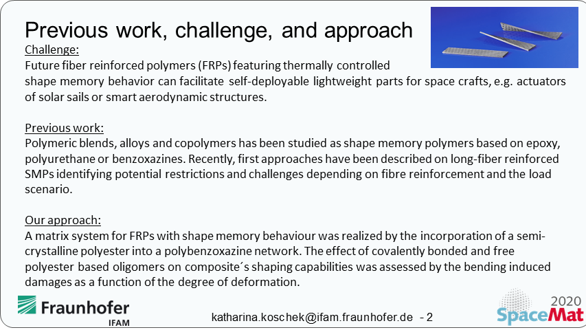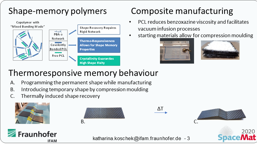 This contribution gives access to fiber reinforced polybenzoxazine and polyester based copolymers with a thermally controlled shape memory behaviour that can facilitate self-deployable lightweight parts. Polyester based oligomers were added to benzoxazine monomers affecting both material´s final and benzoxazine´s processing properties. Moreover, the polyester component introduced thermoresponsive properties into the composites allowing for post-manufacturing shaping and self-deploying behaviour.