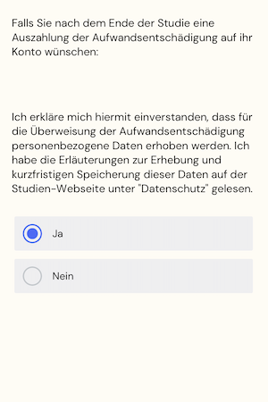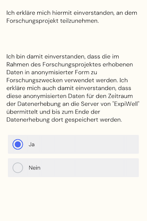 Zunächst werden Sie gefragt, ob Sie mit der Teilnahme und der Nutzung der anonymisierten Daten zu Forschungs- und Publikationszwecken einverstanden sind. Das Bild zeigt beispielhaft die Darstellung in der App.