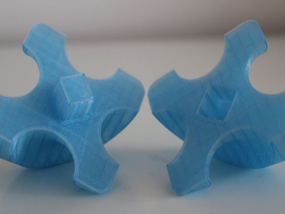 Das Sphericon ist die konvexe Hülle des ausgestellten 3D-Ausdrucks (s. Fotos). Er wurde erstmals in den 1960er Jahren entdeckt, als der britische Zimmermann Colin Roberts nach einer Umsetzung des Möbiusbandes in Form eines geometrischen Körpers ohne Loch suchte. Der Körper setzt sich aus zwei Doppelkegeln zusammen, wobei eine Hälfte um 90 Grad rotiert ist. Damit die Schnittflächen beider Hälften identisch sind, müssen Radius r und Höhe h der Kegel gleich sein. Stößt man das Sphericon an, so rollt es seine gesamte Oberfläche ab. Dabei entsteht eine torkelnde Bewegung ("Torkelkörper"), wobei das Sphericon in der Tendenz geradeaus rollt. Dies lässt sich durch das alternierende Verhalten seiner Rotationskurve entlang des Schwerpunkts erklären (s. Kurzbeschreibung). Der Schwerpunkt ist gleichzeitig der Mittelpunkt des Sphericons. Er legt während einer Rotation insgesamt den Umfang der Kegelgrundfläche zurück. Die Schnittfläche zweier Doppelkegel ist ein Quadrat. Selbiges Konstruktionsverfahren kann auch für Polygone mit gerader Eckenanzahl durchgeführt werden. Zeigen dabei jeweils eine Ecke nach oben bzw. nach unten, so entsteht ein neuer Körper mit zwei Kanten und einer Oberfläche, entlang derer dieser sich abrollt. Zeigen jedoch die Kanten nach unten bzw. oben, so entsteht ein Körper mit einer Kante und zwei Oberflächen. |