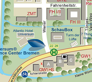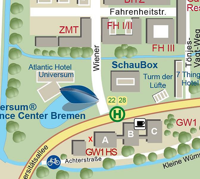 Der Anlieferungsort (X) ist in diesem Jahr sowohl über die Universitätsallee als auch über die Achterstr. zu erreichen.