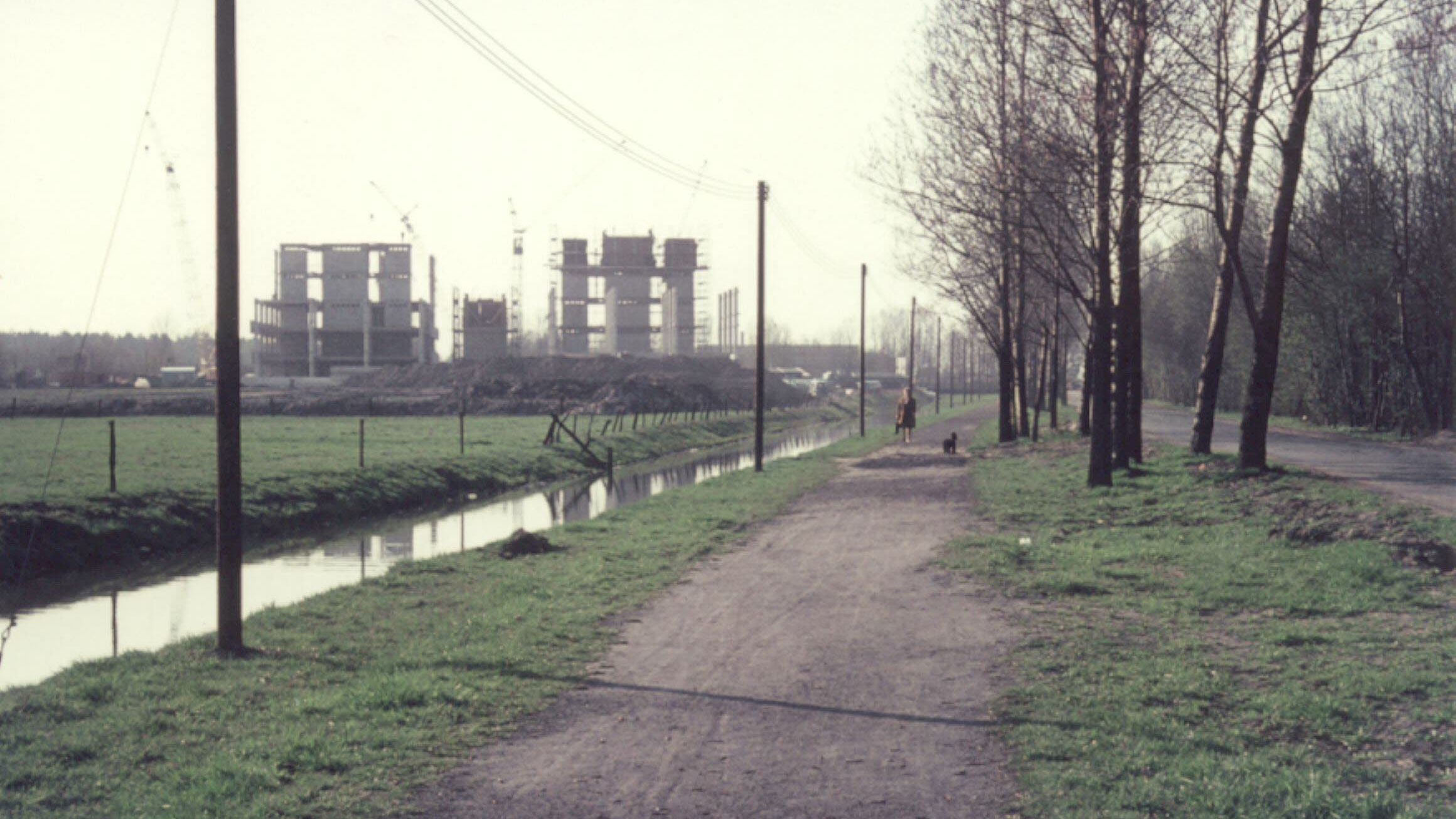 Foto: Links im Bild das Mehrzweckhochhaus, unten im Bild der Mensateich. Aufnahme April 1977