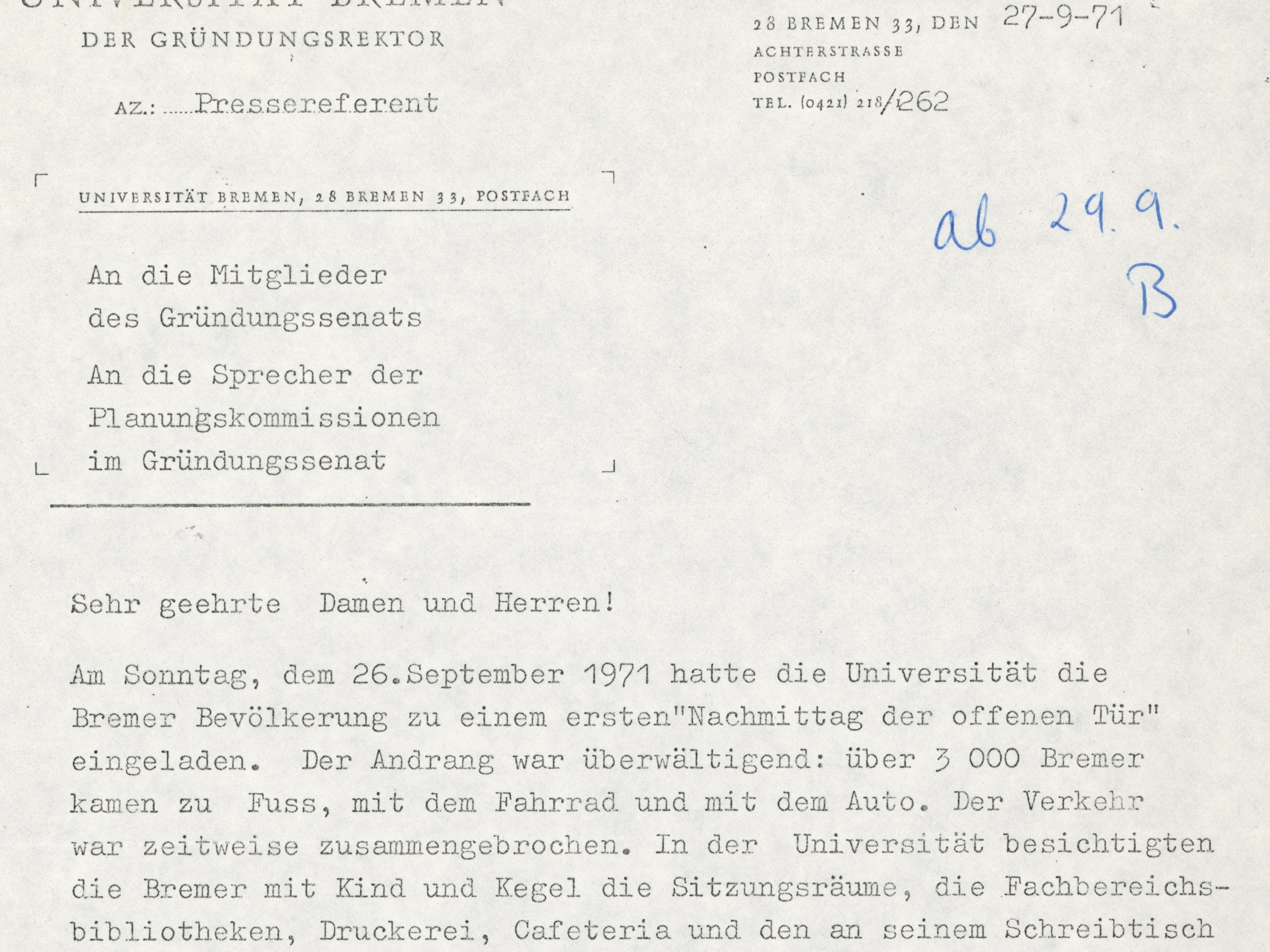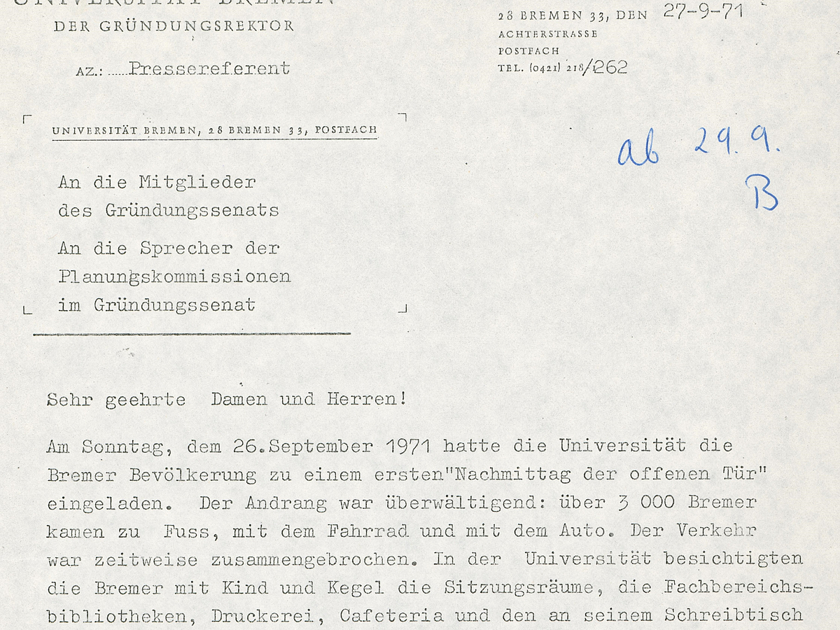 Foto: Auszug aus einem Schreiben des Pressesprechers an den Gründungssenat vom 27.9.1971