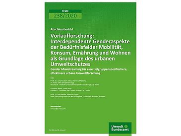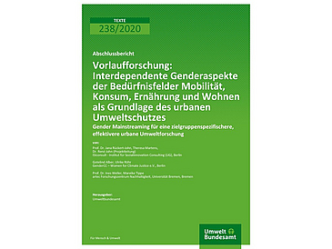 Im Rahmen des Projektes "Interdependente Genderaspekte der Bedürfnisfelder Mobilität, Ernährung, Bekleidung, Wohnen als Grundlage des urbanen Umweltschutzes" haben Prof. Dr. Jana Rückert-John, Theresa Martens und Dr. René John (ISIconsult - Institut für Sozialinnovation Consulting (UG), Berlin), Gotelind Alber und Ulrike Röhr (GenderCC – Women for Climate Justice e.V., Berlin) sowie Prof. Dr. Ines Weller und Mareike Tippe (artec Forschungszentrum Nachhaltigkeit, Universität Bremen) den Abschlussbericht : "Vorlaufforschung: Interdependente Genderaspekte der Bedürfnisfelder Mobilität, Konsum, Ernährung und Wohnen als Grundlage des urbanen Umweltschutzes. Gender Mainstreaming für eine zielgruppenspezifischere, effektivere urbane Umweltforschung" publiziert.