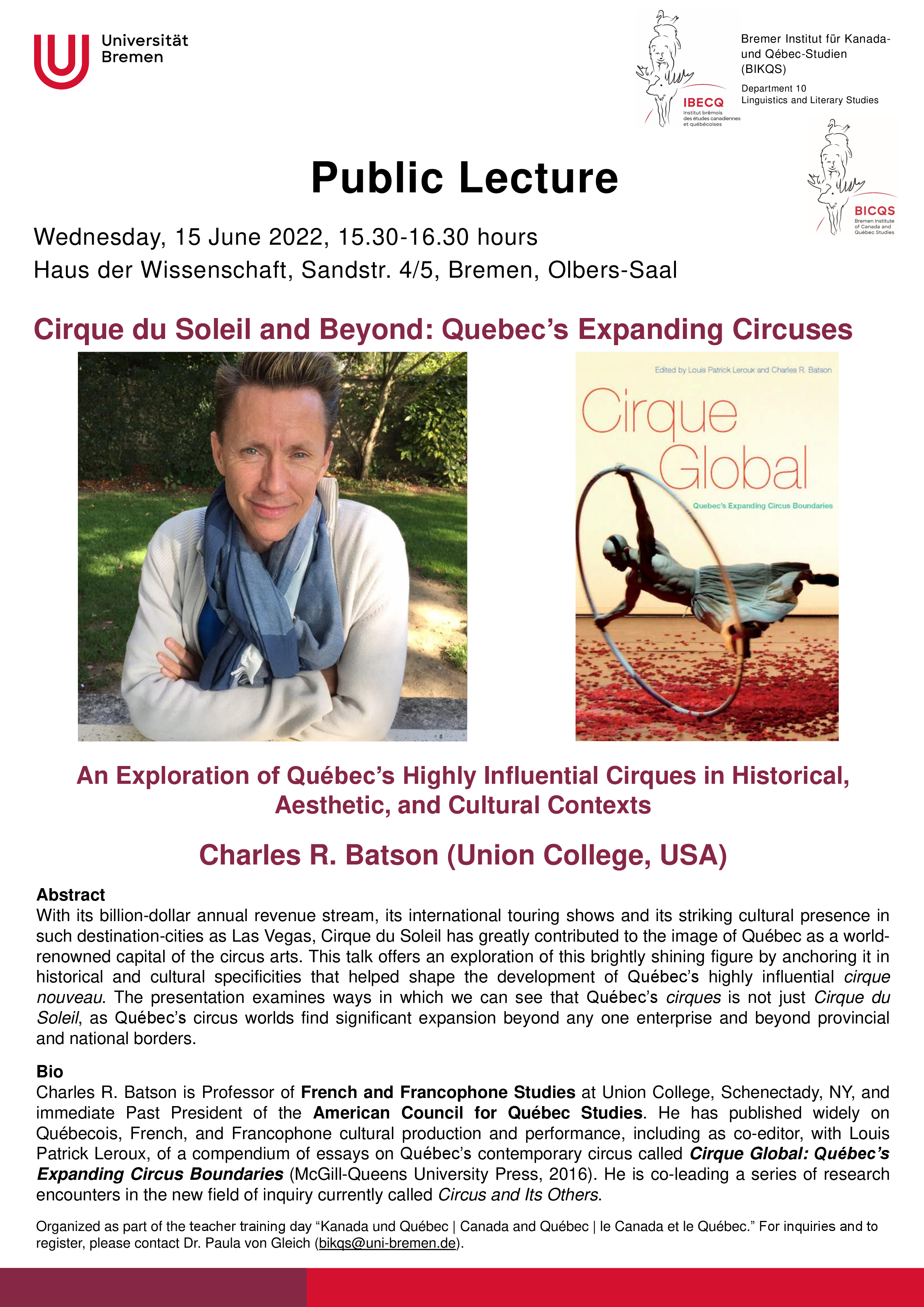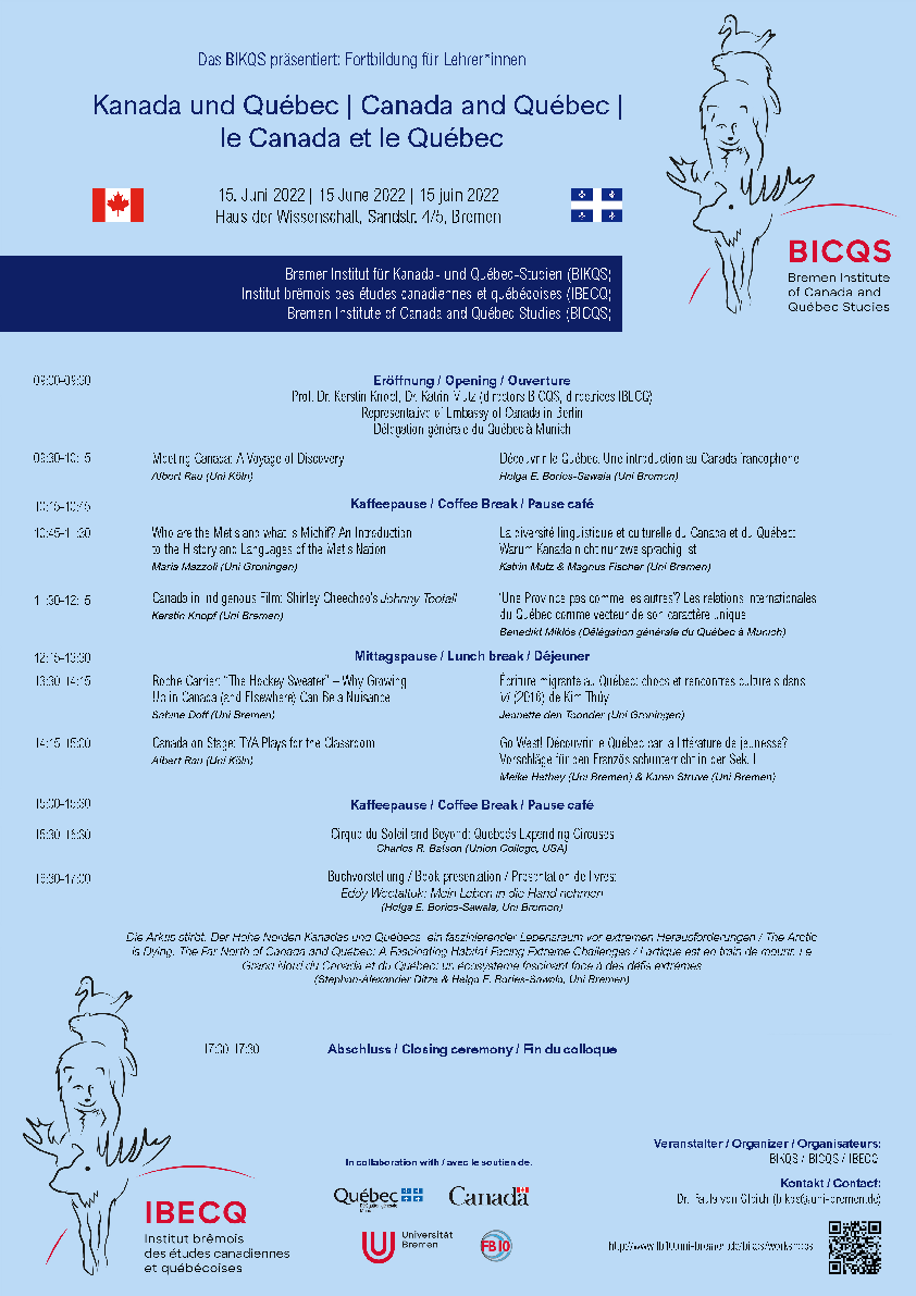 Das Bremer Institut für Kanada- und Quebec-Studien führte am 15. Juni 2022 mit Expert*innen der Universitäten Bremen, Köln und Groningen eine Lehrer*innenfortbildung im Haus der Wissenschaft durch, auf der in einzelnen Vorträgen und Workshops materialbasierte Einführungen zu Kanada und Diskussionen zu Literatur, Film, Sprachen und Politik sowie zu speziellen Themen wie den indigenen Kulturen Kanadas und dem berühmten Cirque du Soleil aus Quebec stattfanden. Letzterer wurde von unserem Gast aus Nordamerika, Prof. Dr. Charles Bateson, dem ehemaligen Präsidenten des American Council for Quebec Studies, präsentiert.