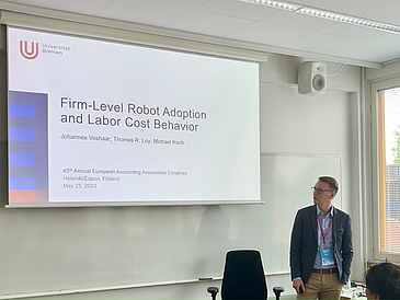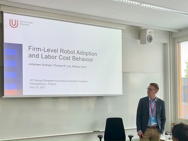 Zusammen mit den Co-Autoren Thomas Loy und Michael Koch (Aarhus University) analysiert Johannes Voshaar in dem präsentierten Working Paper die Auswirkungen der Nutzung von Industrierobotern in spanischen Industrieunternehmen auf die Personalkosten. Die Untersuchung soll Aufschluss darüber geben, ob der Einsatz von Technologie in Fertigungsprozessen vornehmlich zu einem Verdrängungseffekt menschlicher Arbeit oder vielmehr zu einem Upskilling der eingesetzten Arbeitskräfte führt. Die Ergebnisse zeigen, dass die Personalkosten für Industrieunternehmen, die Roboter in der Fertigung einsetzen, im Fall des Umsatzrückgangs weniger stark zurückgehen, als sie bei einem Umsatzanstieg steigen. Die erhöhte Labor Cost Stickiness von Industrieunternehmen mit automatisierten Fertigungsprozessen deutet auf einen Upskilling-Effekt hin. Während weniger qualifizierte Arbeitskräfte in der Produktion durch Roboter ersetzt werden, steigt zeitgleich der Bedarf an höher-qualifizierten Arbeitskräften (Techniker, Mechaniker, Programmierer, etc.), um die Industrieroboter zu installieren, zu warten und zu programmieren. Das Working Paper findet sich unter: https://ssrn.com/abstract=4315287.