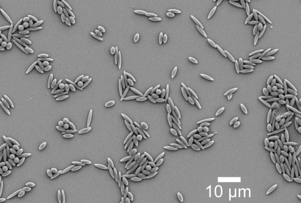 Im Streckprozess umgeformte fluoreszierende Polystyrol-Mikropartikel zur Untersuchung des Formeinflusses.