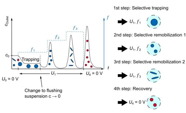Prinzipskizze einer mehrdimensionalen Trennung nach Größe, Form und Material in einem DEP-Filter. In mehreren Schritten werden zunächst alle Partikel bis auf eine Art im Filter zurückgehalten und anschließend selektiv wieder herausgelöst. Die Abscheidung und Remobilisierung werden durch die Frequenz f des elektrischen Feldes gesteuert und erfolgen eigenschaftsspezifisch. Der Graph auf der linken Seite zeigt, welche Partikel im Verlauf des Experiments am Kanalauslass detektiert werden.