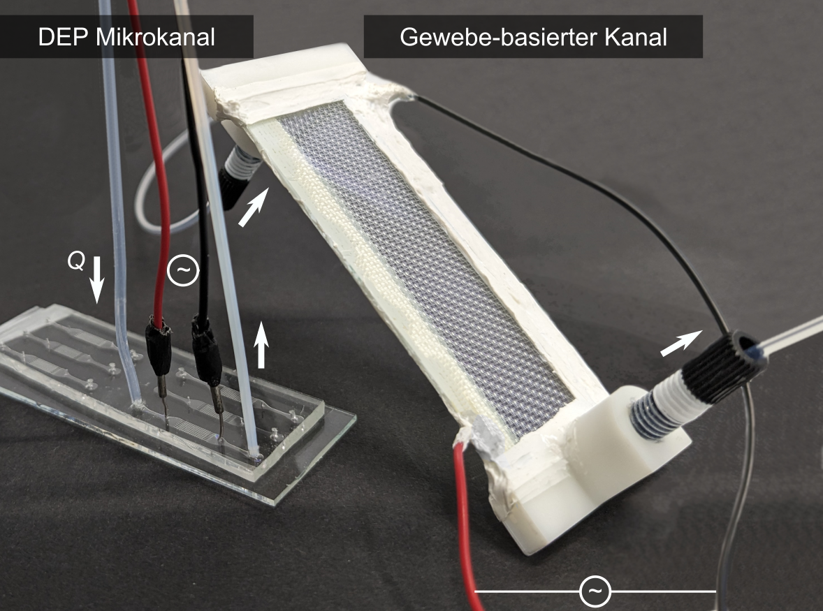 Die meisten herkömmlichen DEP-Anwendungen basieren auf mikrofluidischer Technik, also auf sehr kleinen Maßstäben der Kanäle und Elektroden, und werden bei geringen Durchflüssen betrieben. Maßstabsvergrößerungen sind schwierig, da der Feldgradient sehr stark mit der Entfernung vom erzeugenden Elektrodenarray abnimmt. Mit der dielektrophoretischen Filtration forschen wir an einer Möglichkeit, diese inhärente Limitierung zu umgehen. Hierbei wird der für die DEP notwendige Feldgradient durch die Störung des Felds an isolierenden Strukturen erzeugt. Die isolierenden Strukturen können z. B. poröse Keramiken, Glaskugelschüttungen oder Polymergewebe sein, die dann als (elektrisch) schaltbare Filter fungieren. Hierin ist der Feldgradient vom Durchsatz entkoppelt, was ein Betrieb im präparativen oder sogar industriellen Maßstab möglich macht. Sind die Filterstrukturen groß genug gewählt, sodass keine Partikel durch Größenausschluss abgetrennt werden, so lassen sich gefangene Partikel nach Abschalten des Feldes rückgewinnen.