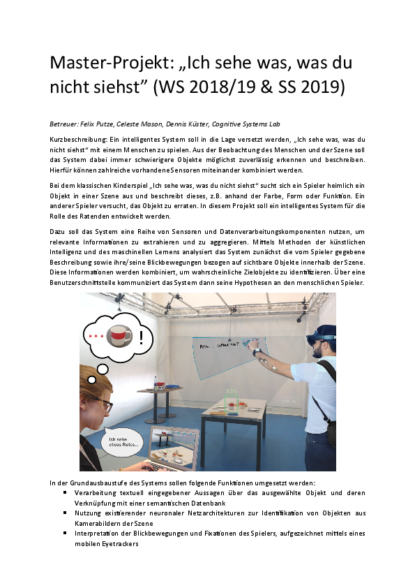 Short description: An intelligent system should be able to play "I spy with my little eye" with a human player. By observing the human being and the scene, the system should recognize and describe increasingly difficult objects as reliably as possible. For this, numerous existing sensors can be combined with each other.