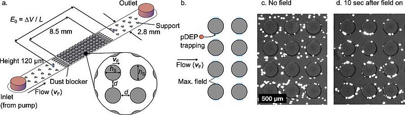 Dielectrophoresis (DEP) is a versatile technique for the solution of difficult (bio-)particle separation tasks based on size and material. Particle motion by DEP requires a highly inhomogeneous electric field. Thus, the throughput of classical DEP devices is limited by restrictions on the channel size to achieve large enough gradients. Here, we investigate dielectrophoretic filtration, in which channel size and separation performance are decoupled because particles are trapped at induced field maxima in a porous separation matrix. By simulating microfluidic model porous media, we derive design rules for DEP filters and verify them using model particles (polystyrene) and biological cells (S. cerevisiae, yeast). Further, we bridge the throughput gap by separating yeast in an alumina sponge and show that the design rules are equally applicable in real porous media at high throughput. While maintaining almost 100% efficiency, we process up to 9 mL min−1, several orders of magnitude more than most state-of-the-art DEP applications. Our microfluidic approach provides new insight into trapping dynamics in porous media, which even can be applied in real sponges. These results pave the way toward high-throughput retention, which is capable of solving existing problems such as cell separation in liquid biopsy or precious metal recovery.