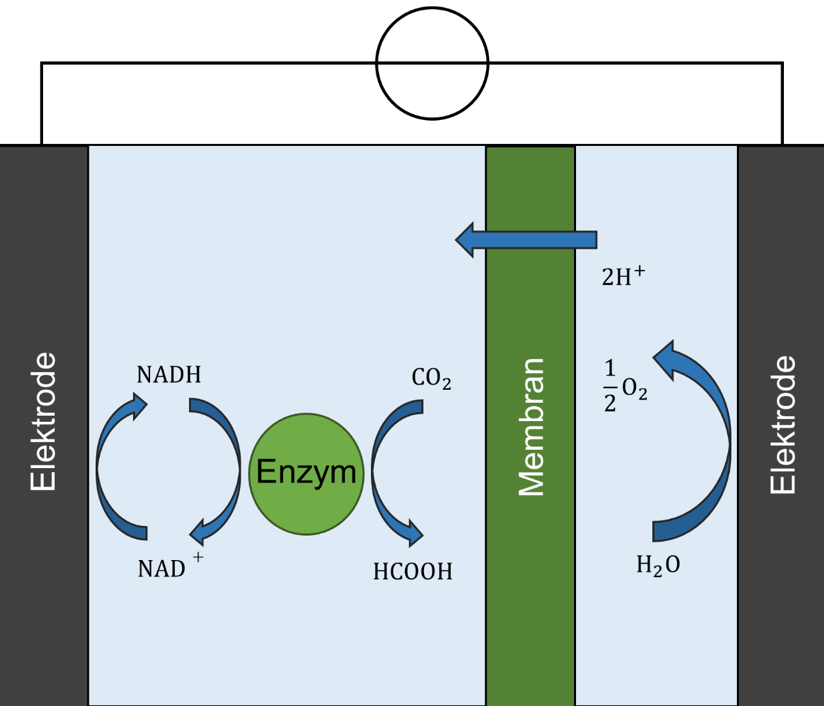 In contrast, enzymatically catalyzed reactions are very easy to control because they can take place at atmospheric pressure and room temperature, and each enzyme catalyzes a specific reaction pathway, so that the reaction products are clearly defined. During the enzymatic conversion of CO2, the enzymes consume the cofactor NADH, which acts as an energy source for the reaction. The aim is to create a circular process in which enzymes convert CO2 into high-value chemicals (such as formate and methanol). The consumed cofactor NADH is regenerated electrochemically at an electrode. This requires only low voltages, and the cofactor regeneration can be powered by renewable energy sources, for example.