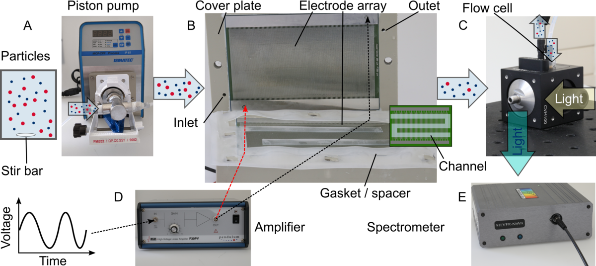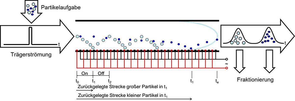 Dielectrophoretic particle chromatography (DPC) is a separation method for a variety of microparticles, these can be of biological, synthetic or natural origin. By influencing the particles with inhomogeneous electric fields, specific residence times or separation rates for different particles are obtained. The method is suitable for the analysis and separation of microparticles. In addition, the scalability of electrode-based dielectrophoresis using low-cost printed circuit boards (PCB) is investigated.
