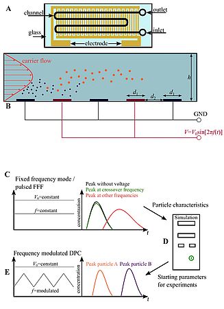 Experimental setup based on a printed circuit board. The particles are suspended in water and pumped into the separation device (B) using a piston pump (A). Two printed circuit boards, on which the electrode arrays are located, form the separation chamber. The electrodes are connected to an amplifier that supplies a sinusoidal voltage to operate the device (D). The suspension emerging from the channel flows into a flow cell (C) that is coupled to a light source. The resulting fluorescence signal is recorded by a spectrometer (E) connected to a computer.