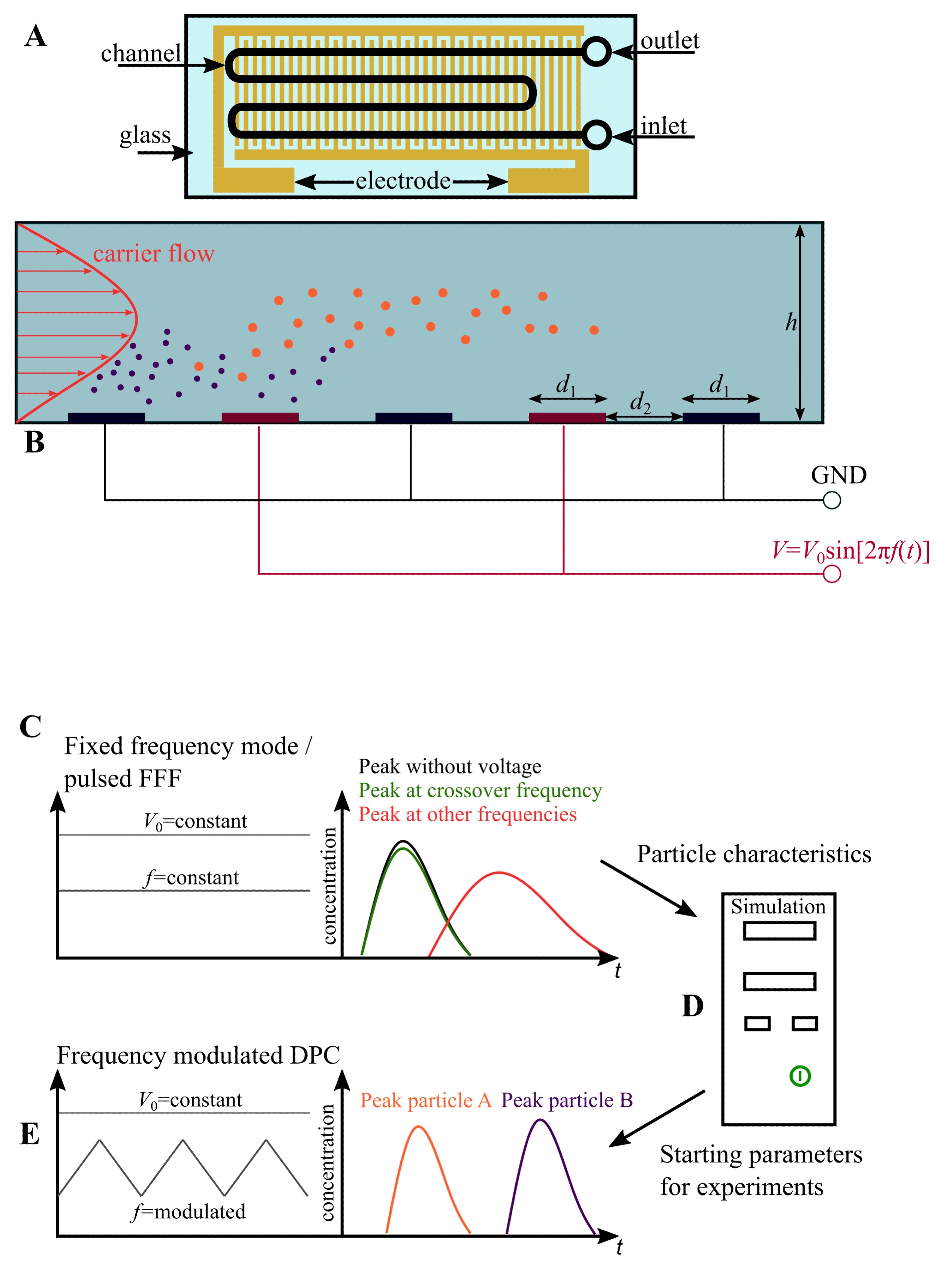 Workflow of dielectrophoretic particle chromatography (DPC). (A) Top view of the microfluidic device (sketch). (B) The microfluidic separation column (side view, height h = 80 μm and electrode width/spacing d1 = d2 = 100 μm) is continuously flushed with a carrier fluid. The device is used for two different types of experiments. (I) The crossover frequency of the particles is determined using field-flow fractionation (FFF) at a fixed frequency f by comparing the elution profiles with and without applied voltage (V0) (C). The particle properties obtained were used as input parameters for a full-scale simulation model implemented in COMSOL Multiphysics to find suitable process parameters (D). (II) Finally, the set of process parameters is used as a starting point for experiments to achieve chromatographic separation using frequency-modulated (f = f(t)) DPC (E).