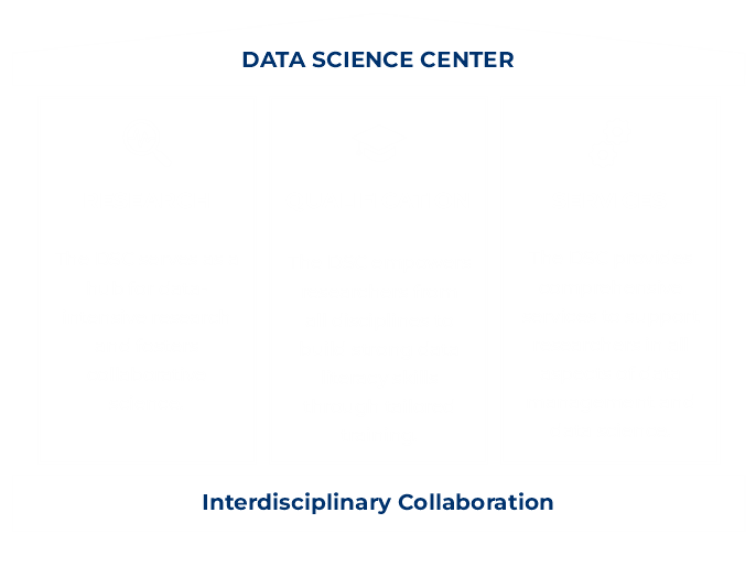 Within the pillar research, the DSC advances interdisciplinary research in data science to break down the boundaries between domains and create a supportive, collaborative research culture. The pillar qualification reflects the DSC’s commitment to strengthen data science competencies at the University of Bremen and train the next generation by developing data science education and training programs. As part of the pillar services, the DSC offers computing capacities to perform computation-intensive data analyses in research and education as well as methodological and technical support for the implementation of algorithms.