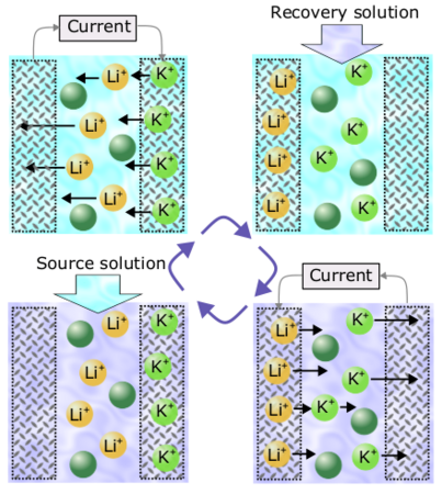 Principle of operation of the ion pump for the extraction of lithium from brines. Lithium is captured from the source solution by a selective electrode (made of LMO) and is then released to the "recovery solution". In the meanwhile, a counter-electrode (made of NiHCF) captures potassium ions from the recovery solution and releases them into the source solution.