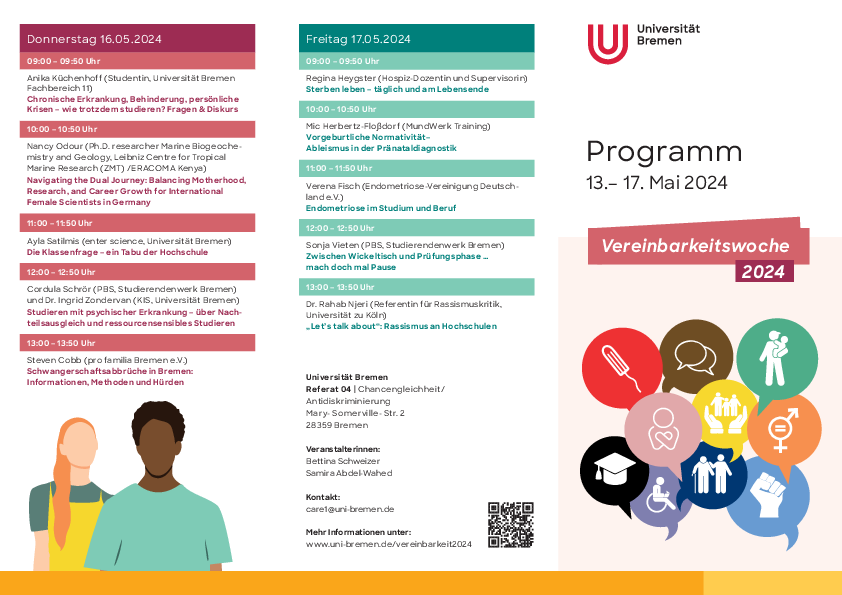 The Digital "Vereinbarkeitswoche" (Study Work Life Week) at the University of Bremen will take place from Monday, May 13th, 2024, to Friday, May 17th, 2024