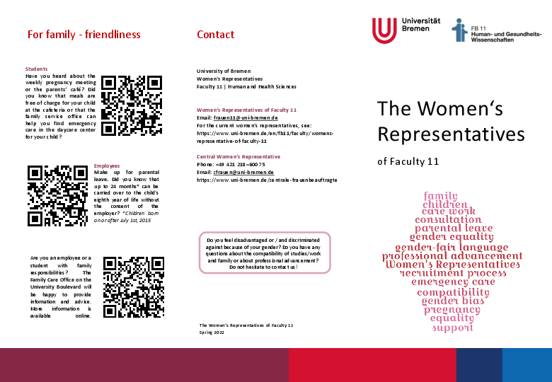 In addition, appointments (face-to-face or online) can be arranged and we are available by e-mail for questions/concerns: frauen11protect me ?!uni-bremenprotect me ?!.de