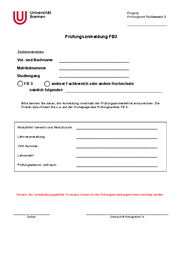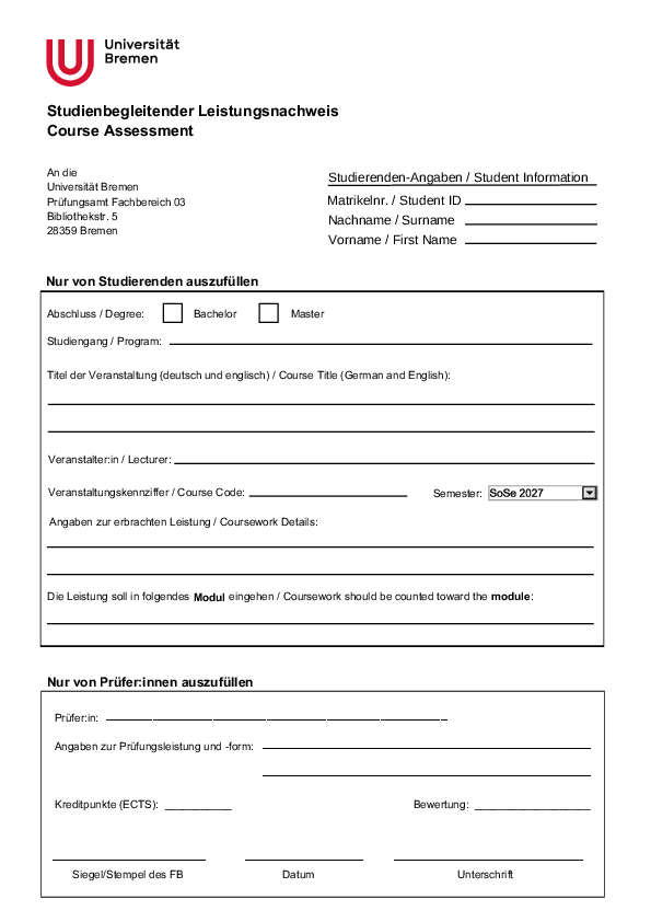 The decentralized examination office of Faculty 3 is responsible for examination matters for the following courses: