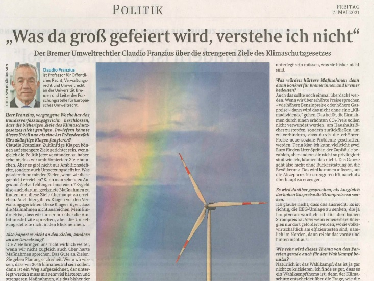 The main research question is to what extent the transnationalisation of climate protection law under the Paris Agreement promises a path to achieve the transformation of legal, political and economic structures deemed necessary to reach the set targets. Workshops will be organised separately for the individual sub-projects. An overview of the subject matter of the project can be found in the articles published in the special issue of Zeitschrift für Umweltrecht (ZUR 2018, 641-690), based on a conference organised by the FEU in May 2018 in Bremen. It is also discussed in Claudio Franzius, Das Paris-Abkommen zum Klimaschutz: Auf dem Weg zum transnationalen Klimaschutzrecht?, ZUR 2017, 515-524.