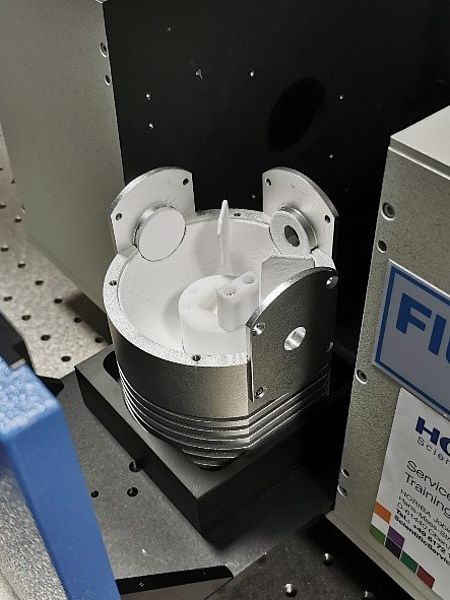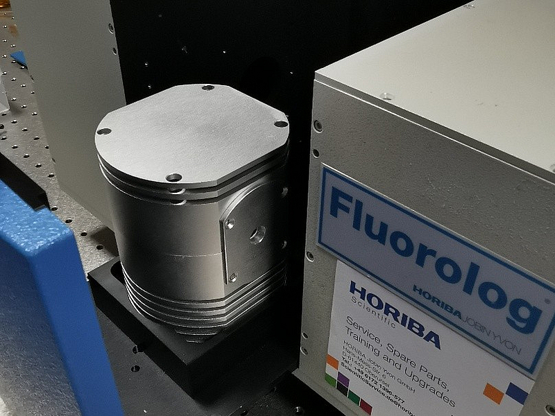 The integrating sphere is shown in the photo and can be inserted directly by the user in the form of an insert into the Flurolog 3 spectrometer from AG Callsen, which considerably simplifies operation.