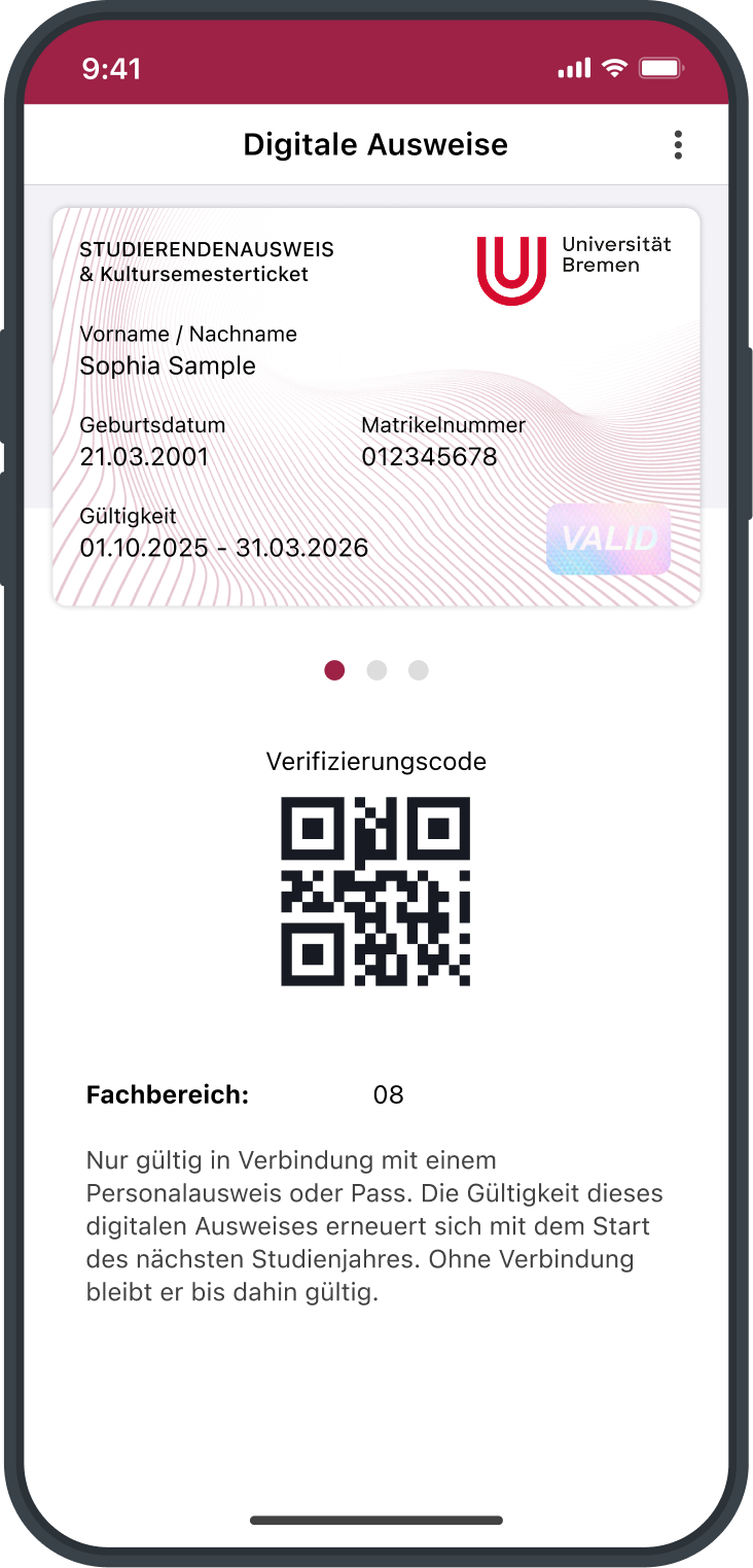 As long as you are enrolled, the ID cards will be displayed in the app and automatically updated at the end of each semester. This is no longer possible after the date of de-registration. The ID cards for the winter semester will be displayed until March 31, 11:59 p.m., and those for the summer semester from April 1.