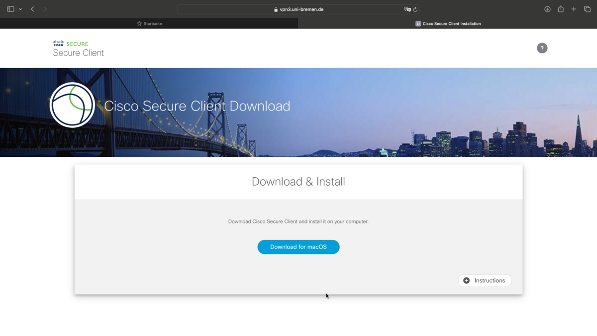 Make sure that your device is connected to the Internet. Open the website https://vpn.uni-bremen.de, log in with your university account and then download the installation file for Cisco Secure Client.