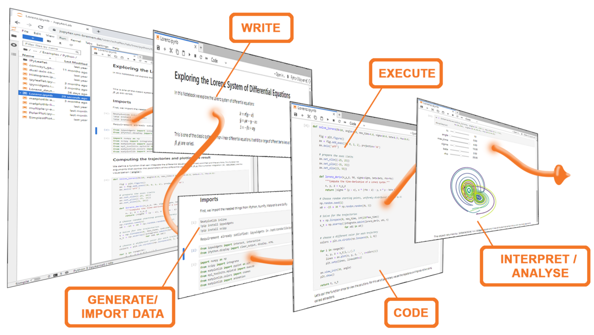 Jupyter Notebooks are supplemented by JupyterLabs with an interactive, web-based development environment, and enable convenient working with the notebooks comparable to desktop programmes.