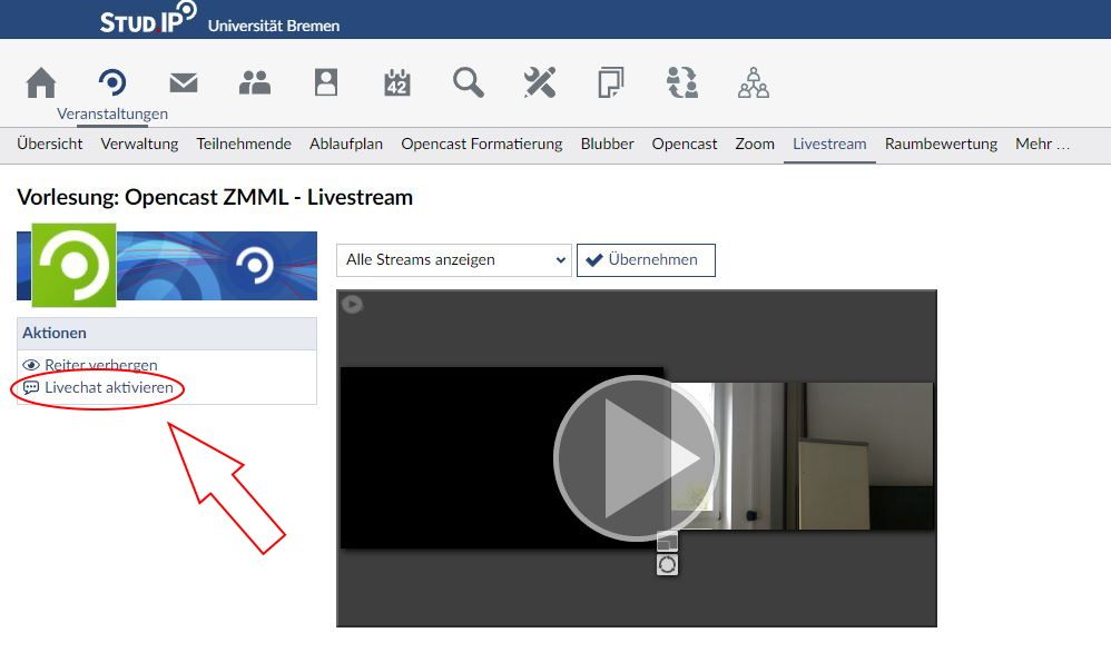 There is the option to activate a live chat in the Livestream plugin of your Stud.IP event. If you want to use the live chat for student questions or similar purposes, please be aware that there is a time delay of approximately 7-40 seconds for viewers of the livestream.