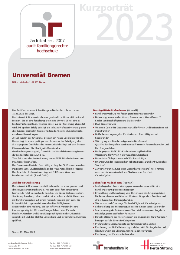Am 13. Juni 2023 wurde die Universität Bremen im Rahmen des Audit familiengerechte Hochschule der berufundfamilie Service gGmbH nun zum sechsten Mal in Folge erfolgreich reauditiert.