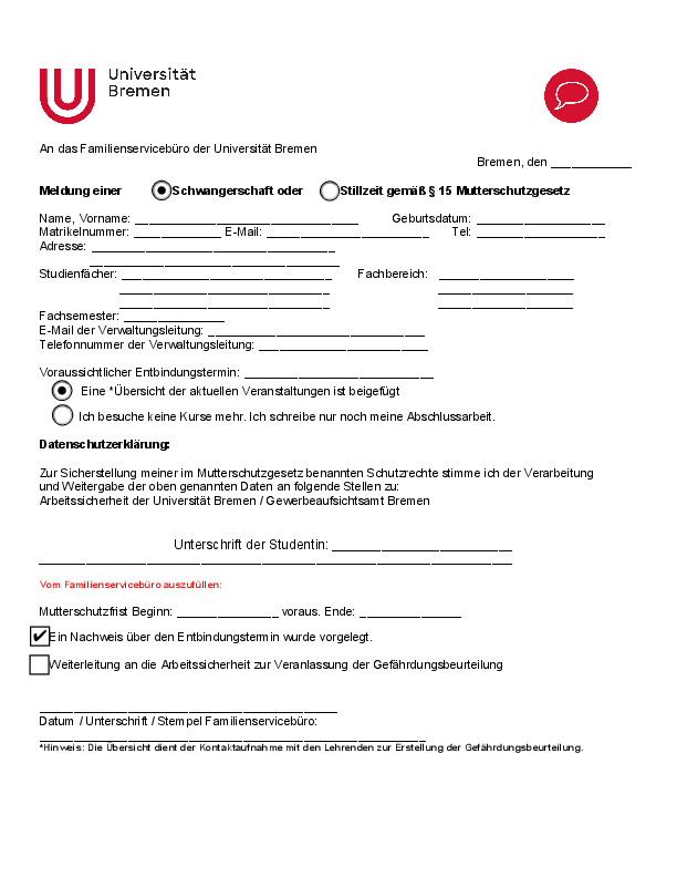 Die Universität Bremen übernimmt die Kosten für Bescheinigungen im Zusammenhang mit dem Mutterschutz, wenn diese im Rahmen des Studiums oder Pflichtpraktikums verlangt werden. Bitte legen Sie die Beträge zunächst aus.