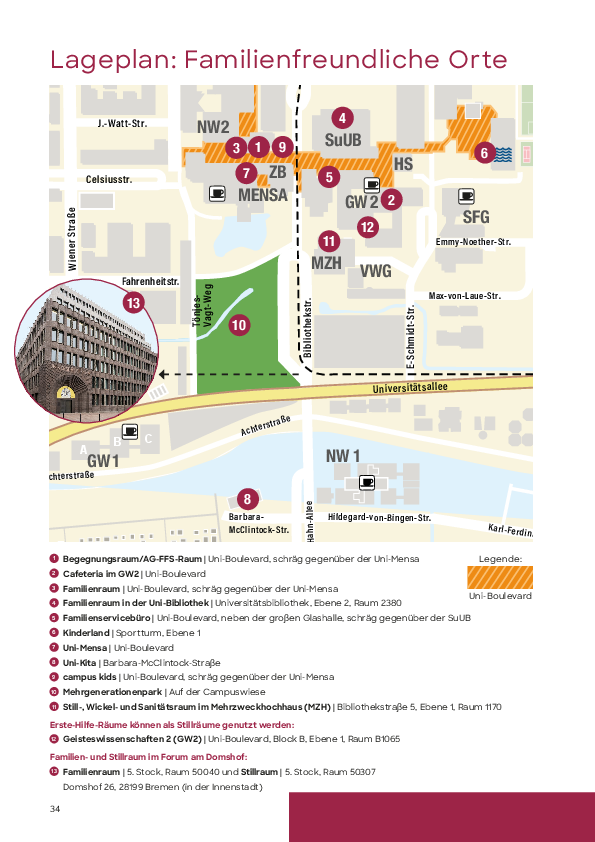 In der Cafeteria im GW 2 gibt es ein großes Holzlaufgitter mit Spielzeug. Hier treffen sich Eltern mit Kindern zum Spielen und Klönen. Zudem befindet sich dort eine Mikrowelle zum Aufwärmen von Baby- und Kleinkindnahrung.