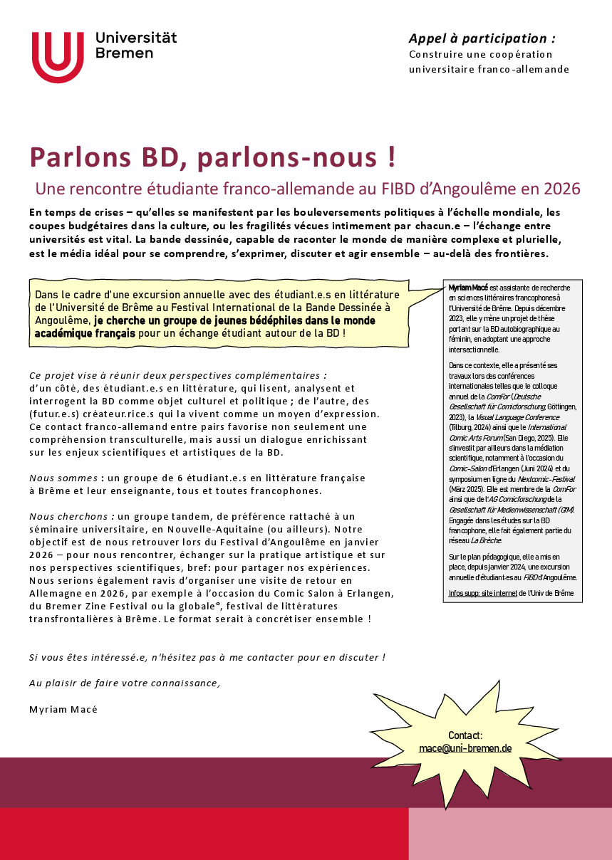 Dateiname: AAP_Cooperation_universitaire_franco-allemande_FIBD2026.pdfÄnderungsdatum: 26.06.2025Studierendenexkursion zum Festival International de la Bande Dessinée