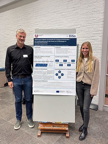 Neben der Teilnahme an Wissenschaftscafés und Diskussionsrunden haben Leona Droste und Andreas Grünewald in einer Postersession empirische Befunde aus ihrem Teilprojekt „Förderung der digitalen Souveränität von Fremdsprachenlehrkräften – Ein Fortbildungskonzept für den Einsatz von KI-Werkzeugen im Fremdsprachenunterricht“ vorgestellt. Ein weiterer interessanter Programmpunkt war die Podiumsdiskussion mit Stakeholdern wie Prof. Dr. Katharina Scheiter (Transferstelle lernen:digital) und Hendrik Stammermann (Leitung Referat Sprachen am Landesinstitut für Qualifizierung und Qualitätsentwicklung in Schulen Hamburg), in welcher der nachhaltige Transfer der Projektergebnisse erörtert wurde. Darüber hinaus wurden Planungsperspektiven für eine zweite Förderphase sowie neue Vernetzungsmöglichkeiten, insbesondere für den wissenschaftlichen Nachwuchs, diskutiert.