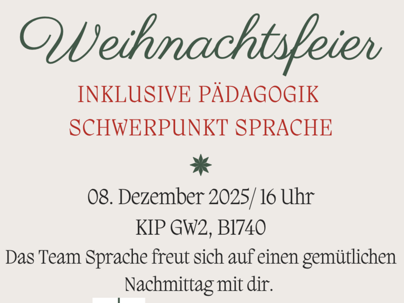 Das Team Sprache lädt zur Weihnachtsfeier ein: Du hast den Förderschwerpunkt Sprache gewählt oder überlegst, welcher Förderschwerpunkt der Richtige ist? Dann bist du herzliche eingeladen, uns bei Plätzchen und Punsch am 08.12.25 ab 16 Uhr in Raum B1740 (KIP GW2) kennenzulernen.