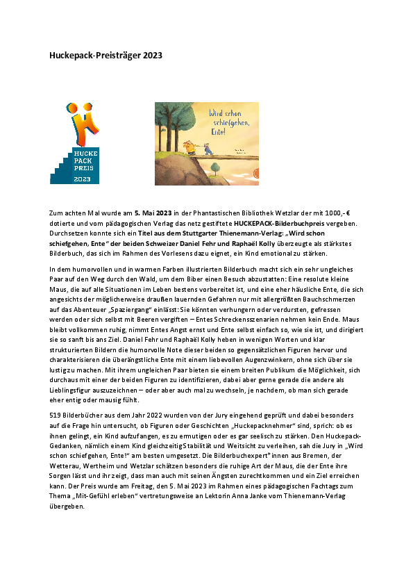Dateiname: Huckepack-Preis_2024.pdfÄnderungsdatum: 29.04.2024„Wird schon schiefgehen, Ente“ von Daniel Fehr (Text) und Raphaël Kolly (Illustration)