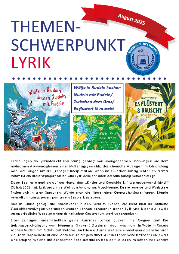Dateiname: 09-2025.pdfÄnderungsdatum: 10.10.2025Bilderbücher des Monats August: Wölfe in Rudeln kochen Nudeln mit Pudeln/ Zwischen dem Gras/ Es flüstert und rauscht