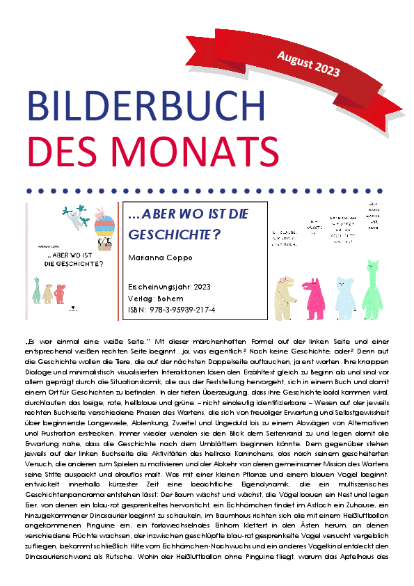 Dateiname: 09.2023.pdfÄnderungsdatum: 20.09.2023Bilderbuch des Monats August: Aber wo ist die Geschichte