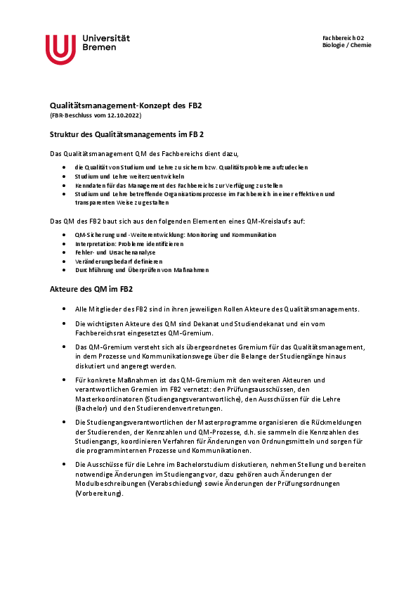 Der Fachbereichsrat des FB 2 hat auf seiner Sitzung am 1. Februar 2012 die Einrichtung und Aufgaben eines beratenden Gremiums zum Qualitätsmanagement in Lehre und Studium (QM-Gremium) im Fachbereich 2 beschlossen. Am 21.10.2015 wurde die Zusammensetzung des QM-Gremiums neu beschlossen.