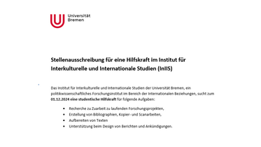 Das InIIS ist eine Forschungseinrichtung am Fachbereich 8 (Sozialwissenschaften) der Universität Bremen und eines der Trägerinstitute des Sonderforschungsbereichs 1342 "Globale Entwicklungsdynamiken von Sozialpolitik" und des Masters International Relations (MAIR). Es verbindet die politikwissenschaftlichen Teildisziplinen der Internationalen Beziehungen und Europäischen Politik mit der Politischen Theorie und repräsentiert mit seinem transnationalen Forschungsprofil einen der sozialwissenschaftlichen Forschungs- und Lehrschwerpunkte an der Universität Bremen.