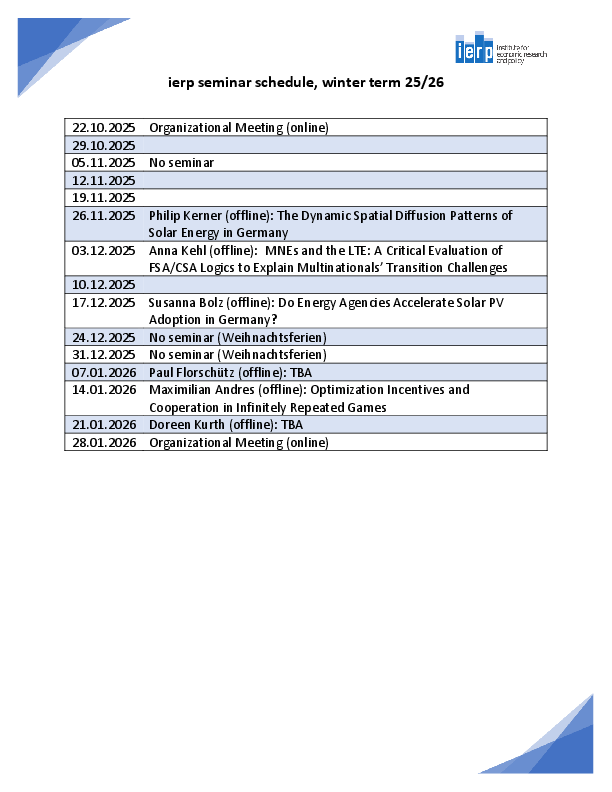 Das IERP Seminar erlaubt es den verschiedenen Arbeitsgruppen des Instituts zusammenzukommen und sich auszutauschen. Zu Beginn und Ende jedes Semesters werden hier organisatorische Dinge geklärt, neue Mitarbeiter haben die Gelegenheit sich vorzustellen und es werden Gäste, Vorträge und Konferenzen angekündigt. Die anderen Termine stehen jedem Mitglied des Instituts offen um neue Ideen, Modelle oder wissenschaftliche Veröffentlichungen zu besprechen um konstruktives Feedback von Kollegen zu erhalten. Das Seminar findet in der Regel jeden Mittwoch während der Vorlesungszeit um 16:00 im Raum F 3290 im Gebäude WiWi2 statt und die Teilnahme ist jedem gestattet.