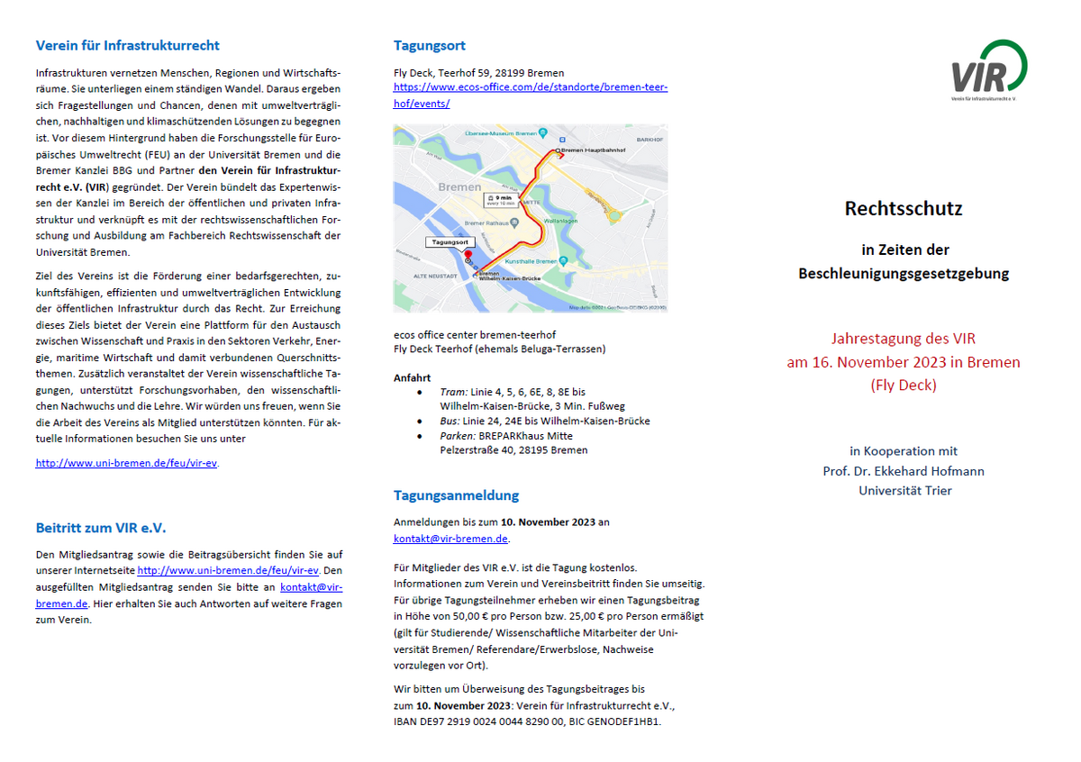 Am 16. November findet die diesjährige Jahrestagung des VIR e.V. statt zu folgendem Thema: "Rechtsschutz in Zeiten der Beschleunigungsgesetzgebung"