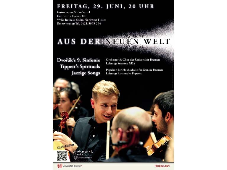 Es liegt nahe, dass der Chor der Universität das Konzert mit genau derjenigen Musik eröffnet, die Dvořák damals in Amerika gehört hat und die ihn so begeistert hat: den Spirituals. Wie sich die afroamerikanische Musik anschließend weiterentwickelte, kann im Anschluss daran im Beitrag des Popchors erlebt werden, bevor nach der Pause schließlich Dvořáks Sinfonie in der hervorragenden Akustik der Gutsscheune Stuhr erklingt.