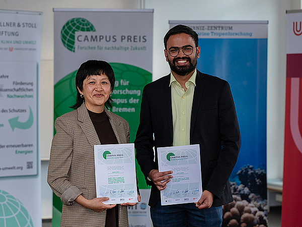 Mit dem diesjährigen "CAMPUS PREIS: Forschen für nachhaltige Zukunft" wurden am 7. Mai eine Dissertation und zwei Masterarbeiten ausgezeichnet. Die diesjährigen Preisträger:innen – Mariela Tapia, Rohit Samant und Niccolò Orlandi – zeigen mit ihren Arbeiten auf beeindruckende Weise, wie Forschung zu nachhaltigen Lösungen beitragen kann. Mit dem CAMPUS PREIS werden herausragende Abschlussarbeiten ausgezeichnet, die sich thematisch dem nachhaltigen Umgang mit Ressourcen und dem Schutz von Umwelt, Klima und Meeren widmen. Der insgesamt mit 3.000 Euro dotierte Preis wurde 2016 ins Leben gerufen und wird jährlich von der KELLNER & STOLL - STIFTUNG FÜR KLIMA UND UMWELT, dem Leibniz-Zentrum für Marine Tropenforschung (ZMT), der Universität Bremen und dem Verein Alumni der Universität Bremen vergeben. Wir gratulieren den Preisträger:innen und unserer Treuhandstiftung zu dieser inspirierenden Veranstaltung!