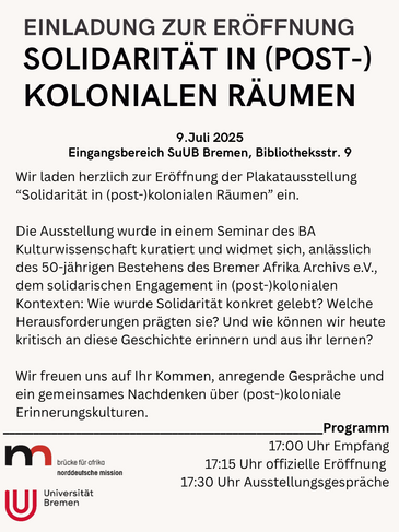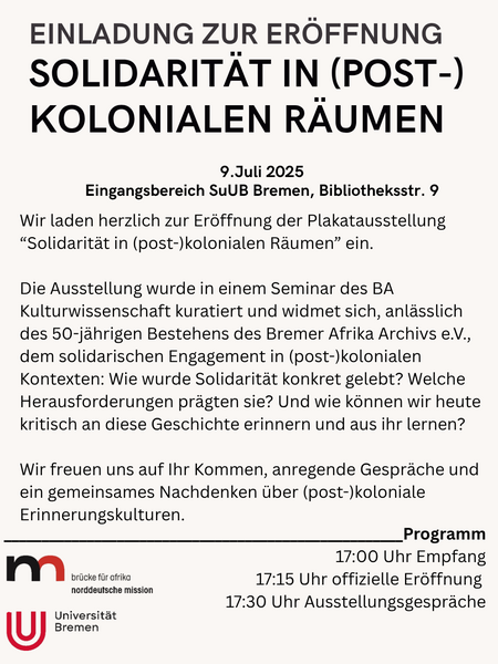 wir laden Sie herzlich zur Eröffnung der Plakatausstellung „Solidarität in (post-)kolonialen Räumen“, am 9. Juli 2025 um 17 Uhr im Eingangsbereich der Staats- und Universitätsbibliothek Bremen ein.
