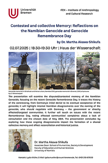 Es geht um die derzeitigen Debatten in Namibia und die lokalen Formen des Erinnerns an den Genozid an Nama und Herero durch die deutsche Kolonialherrschaft.