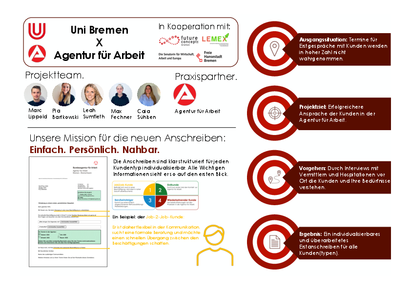 Die erfolgreiche Ansprache von Arbeitssuchenden liegt der Agentur für Arbeit Bremen – Bremerhaven besonders am Herzen, um eine bestmögliche Vermittlung von Jobs zu gewährleisten. Deshalb haben sie eines unserer Studierenden-Teams damit beauftragt, eine Lösung für die Verbesserung der Wahrnehmungsquoten von Erstgesprächen zu erarbeiten. Grund dafür ist, dass die Erstgespräche von vielen Kund:innen nicht in Anspruch genommen werden und das Anschreiben hierfür bisher nur im geringem Umfang individualisierbar war. Konkret bedeutete dies für den Projektauftrag des Studierenden-Teams, bestehend aus Marc Lippold, Pia Bartkowski, Max Fechner, Leah Sumfleth und Caia Sühlsen, die Entwicklung eines kundenspezifischen Anschreibens, ein neues Sprachkonzept und die Anpassung des Layouts von der Einladung zum Erstgespräch.