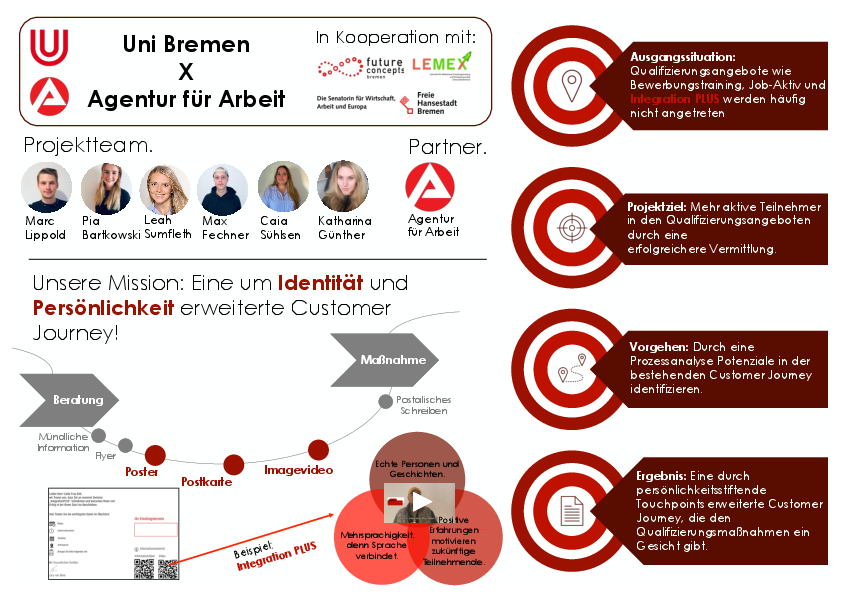 Die Teilnahme an Qualifizierungsangeboten, wie Bewerbungstraining, Job-Aktiv und Integration PLUS zu steigern und die Customer Journey zu optimieren war das Ziel des Praxisprojektes im Sommersemester 2023 mit der Bundesagentur für Arbeit Bremen-Bremerhaven.
